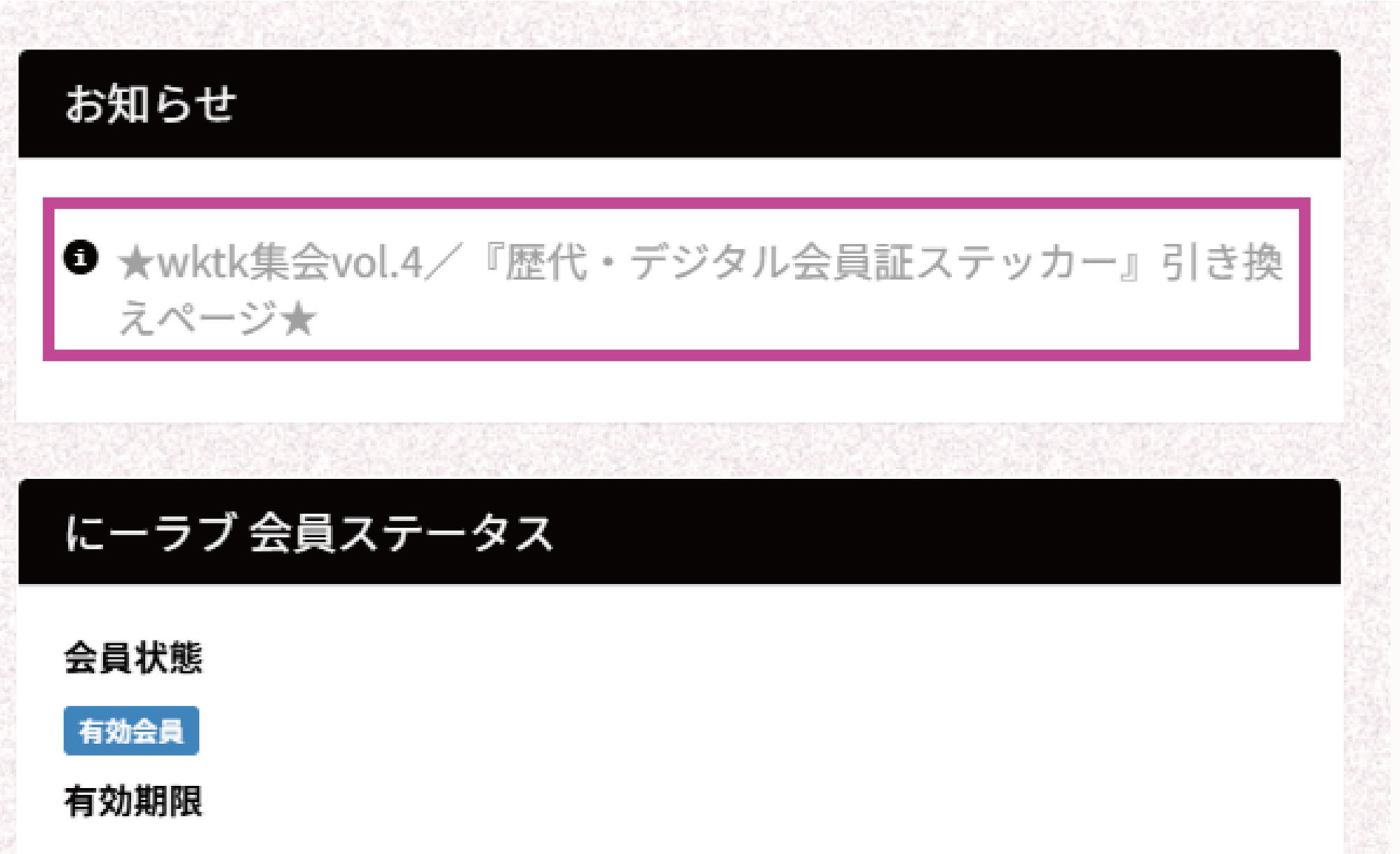 ①ファンクラブにログイン後、【MY PAGE】を開いて<デジタル会員証>の絵柄をスタッフにご提示ください